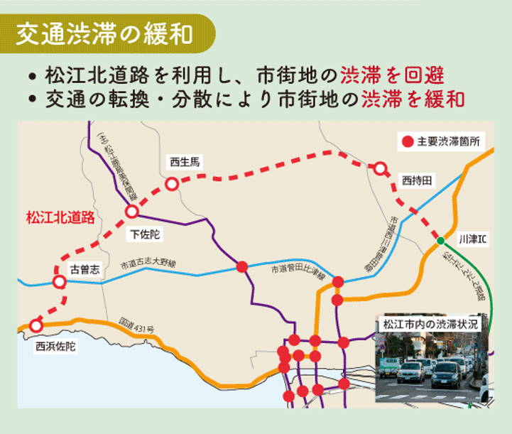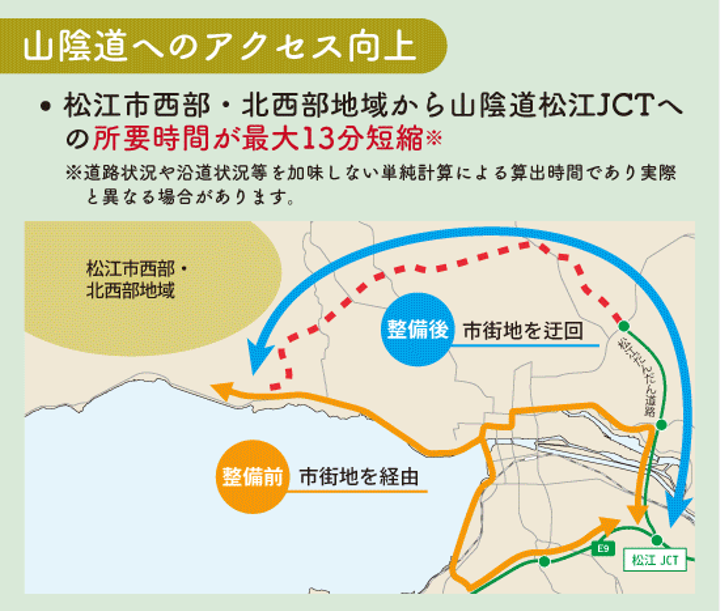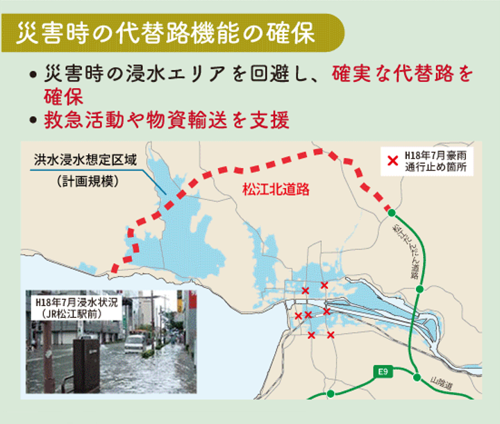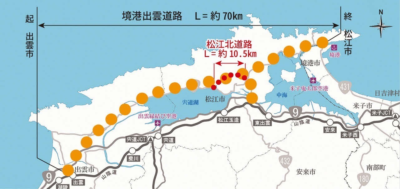 松江北道路とは境港出雲道路の一部として、松江だんだん道路と共に松江市街地の外環状道路を形成し、市街地の渋滞緩和、災害時の代替路の確保、山陰道へのアクセス向上等、地域振興や防災機能強化を目的とした道路です。