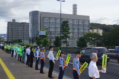 横断幕やハンドプレートを手に持ち、通行するドライバーに対し交通事故防止を呼びかけました。